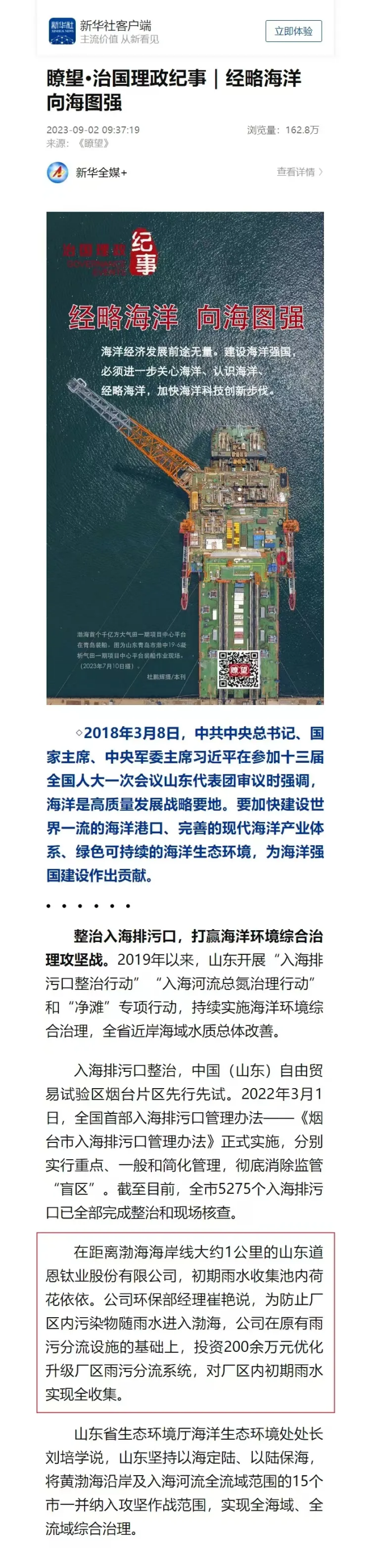 作为钛白行业首个国家级绿色工厂示范企业,FUN88钛业公司走出了一条“雨污分流+清污分流+水质改善+景观提升”新路径,成为龙口市工业企业雨污分流改造的典型案例。未来将以高度的责任感和使命感,持续强化环保设施升级改造,努力建设环境友好型企业,为保护海洋生态环境、推动海洋经济高质量发展贡献更多的力量。