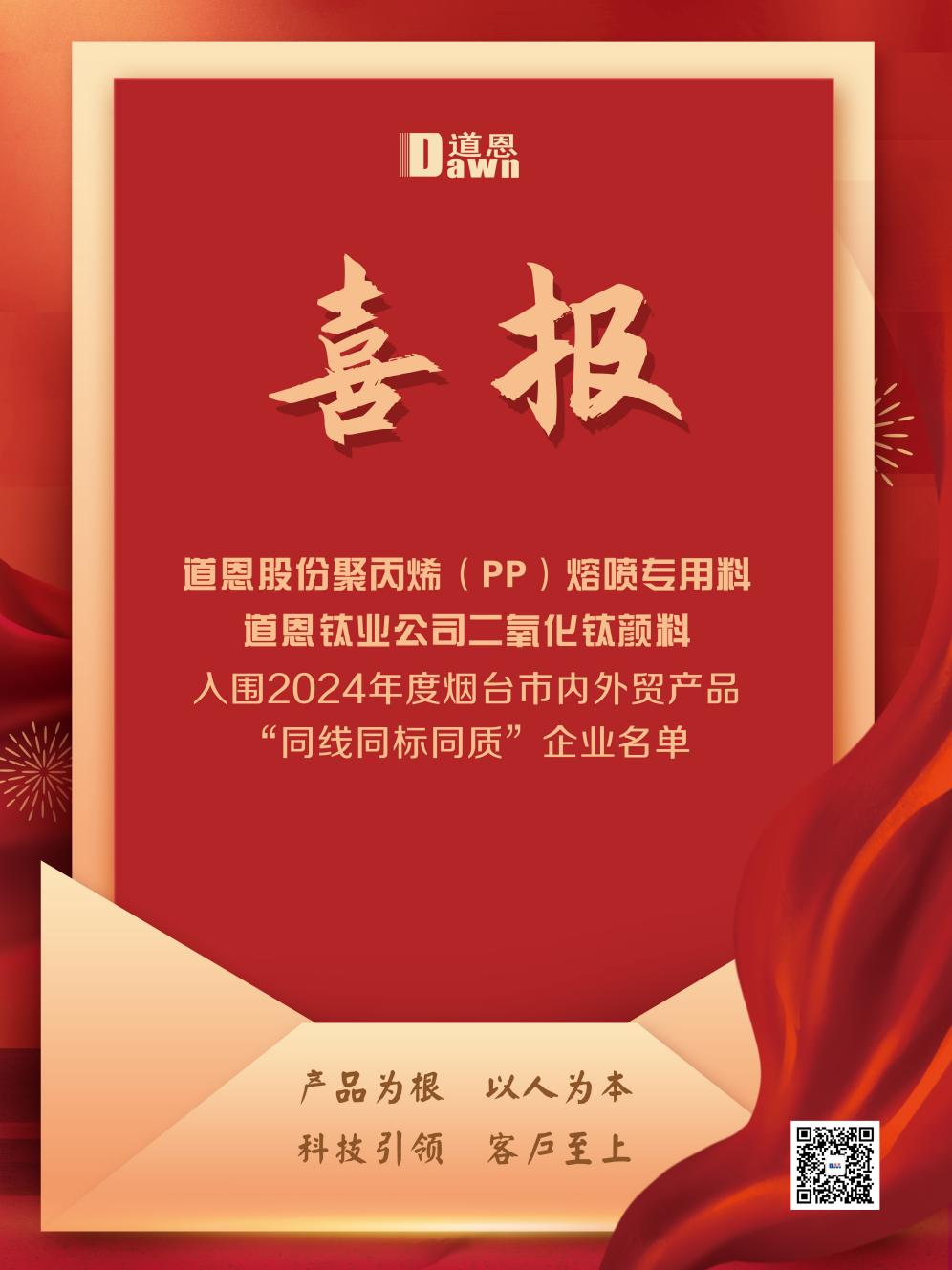 8月30日,烟台市市场监督管理局、烟台市商务局发布2024年度烟台市内外贸产品“同线同标同质”企业名单,FUN88股份的聚丙烯(PP)熔喷专用料、FUN88钛业公司的二氧化钛颜料名列其中,是龙口市唯一入选该名单的企业。