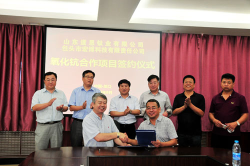 9月13日,山东FUN88钛业有限公司与包头市宏博科技有限责任公司合作的“钛富集物萃取项目”举行了奠基仪式,FUN88集团董事长于晓宁及双方主要领导出席仪式并为项目培土奠基。该产品属于采用新工艺、新技术实施的循环经济工程,注重节能环保、资源利用,预计在今年年底将建成投产。该产品广泛应用于航天、电子、冶金和医疗等高新技术领域。