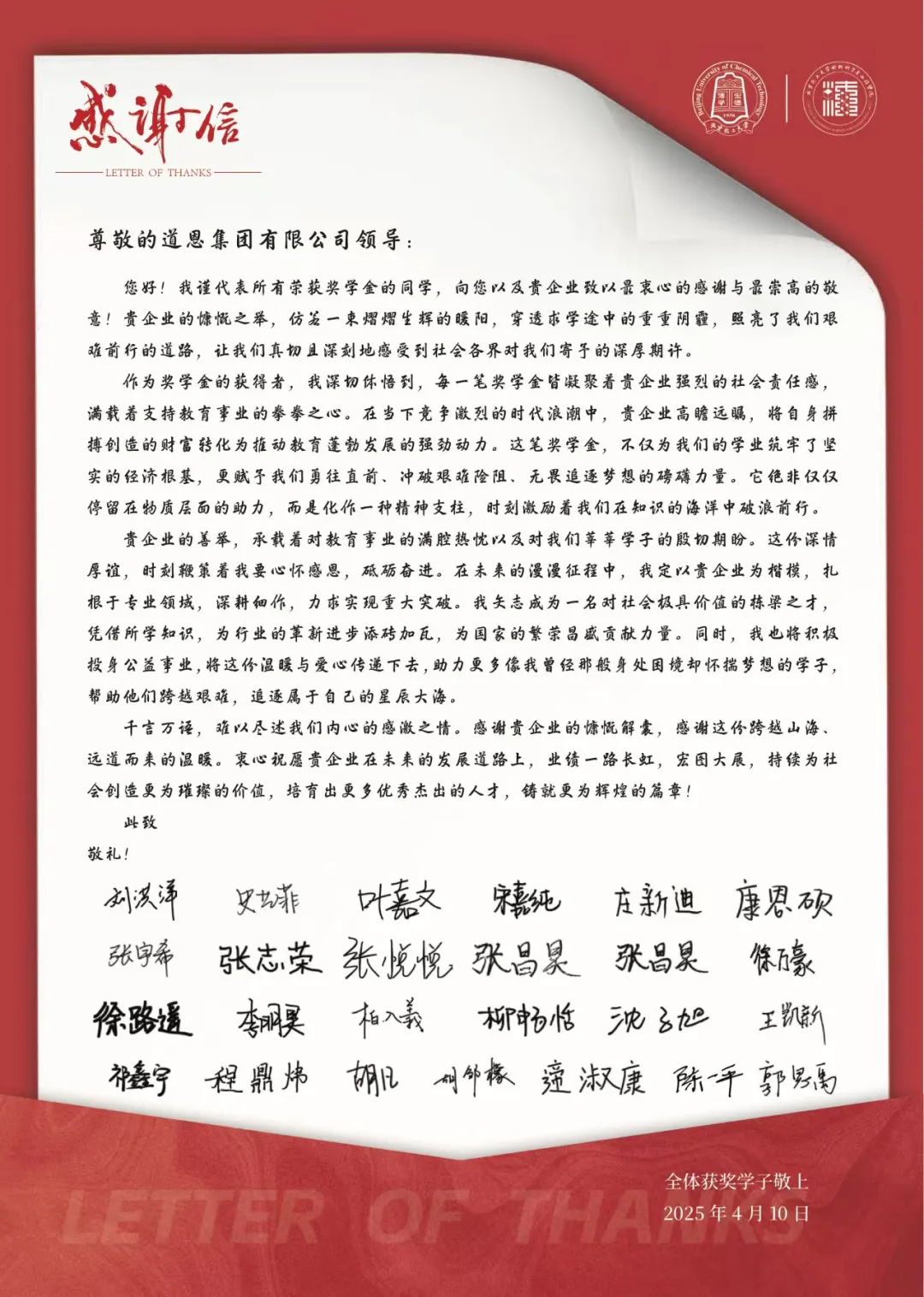 今年4月,北京化工大学获得“FUN88高分子专项奖学金”的学子们,联名给FUN88集团发来感谢信。他们在信中说,“贵企业的善举,承载着对教育事业的满腔热忱以及对FUN88莘莘学子的殷切期盼。这份深情厚谊,时刻鞭策着我要心怀感恩,砥砺奋进。在未来的漫漫征程中,我定以贵企业为楷模,扎根于专业领域,深耕细作,力求实现重大突破。
