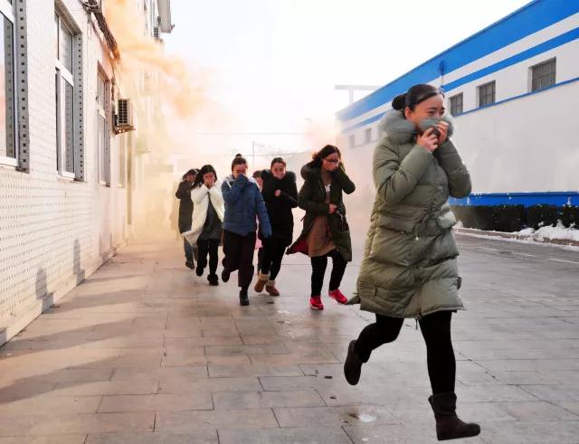 警报声响起,办公楼内所有人员在疏散指挥人员的引导下,快速紧急疏散,弯腰捂鼻,有序撤离至安全区域。集团应急救援队伍灭火组、救援组、通讯组接到命令,紧急携带装备向指挥报到。疏散引导组统计人数,发现1名员工未及时撤出,向指挥报告,同时通讯组拨打120救护电话并派人到路口引导。