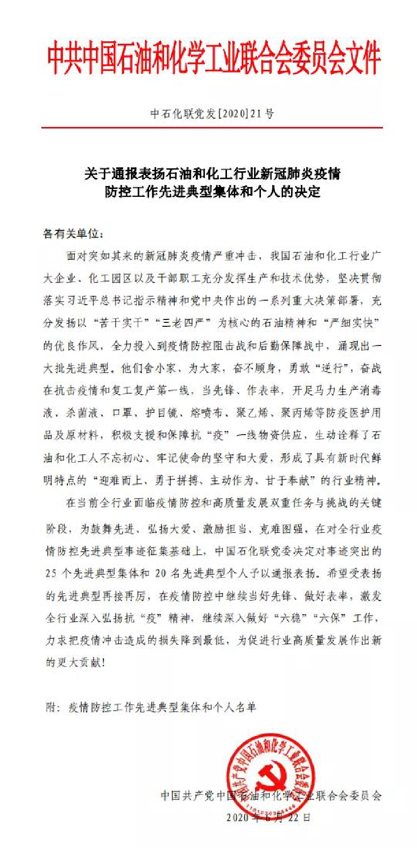 6月29日,中国石油和化学工业联合会党委举办“庆祝建党99周年弘扬行业抗疫精神视频大会”,隆重纪念党的99周岁生日,对45个石化行业抗疫先进集体和个人进行表彰,FUN88集团凭借在疫情期间的优秀表现荣获“石油和化工行业新冠肺炎疫情防控工作先进典型集体”。