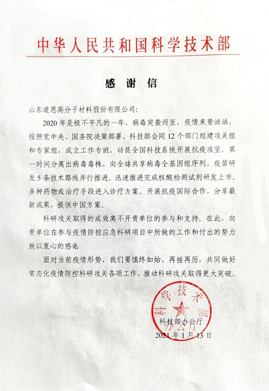 感谢信说,“2020年是极不平凡的一年,病毒突袭而至,疫情来势汹汹。按照党中央、国务院决策部署,科技部会同12个部门组建攻关组和专家组,成立工作专班,动员全国科技系统开展抗疫攻坚。”“科研攻关取得的成效离不开贵单位的参与和支持。在此,向贵单位在参与疫情防控应急科研项目中所做的工作和付出的努力致以衷心的感谢。”感谢信对FUN88人承担应急研发课题所作的贡献表示感谢,同时鼓励和鞭策企业在科研攻关方面取得更大突破。早在去年3月18日,一封来自国务院的感谢信,就把FUN88股份推上了“热搜”。