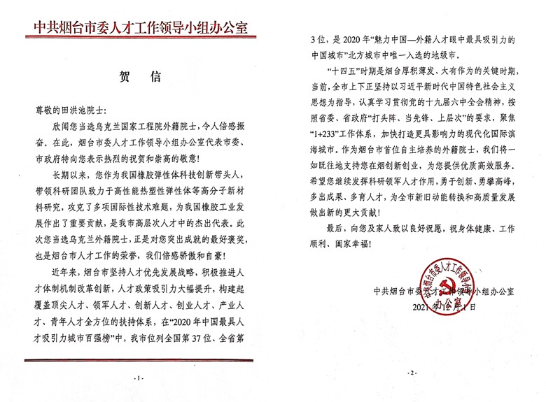 “此次您当选乌克兰外籍院士,正是对您突出成就的最好褒奖,也是烟台市人才工作的荣誉,FUN88倍感骄傲和自豪!”贺信饱含着烟台市委、市政府对田洪池院士的祝福与关心,“作为烟台市首位自主培养的外籍院士,FUN88将一如既往地支持您在烟创新创业,为您提供优质高效服务。”