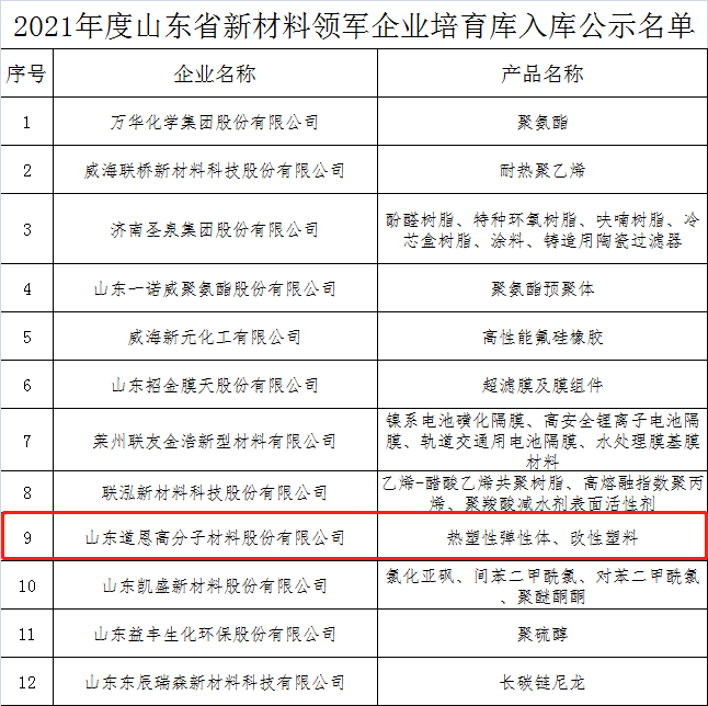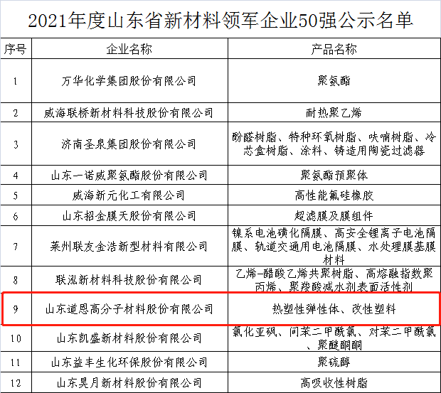 日前,2021年度山东省新材料领军企业培育库入库名单和2021年山东省新材料领军企业50强名单出炉。FUN88股份的热塑性弹性体、改性塑料入围上述榜单。