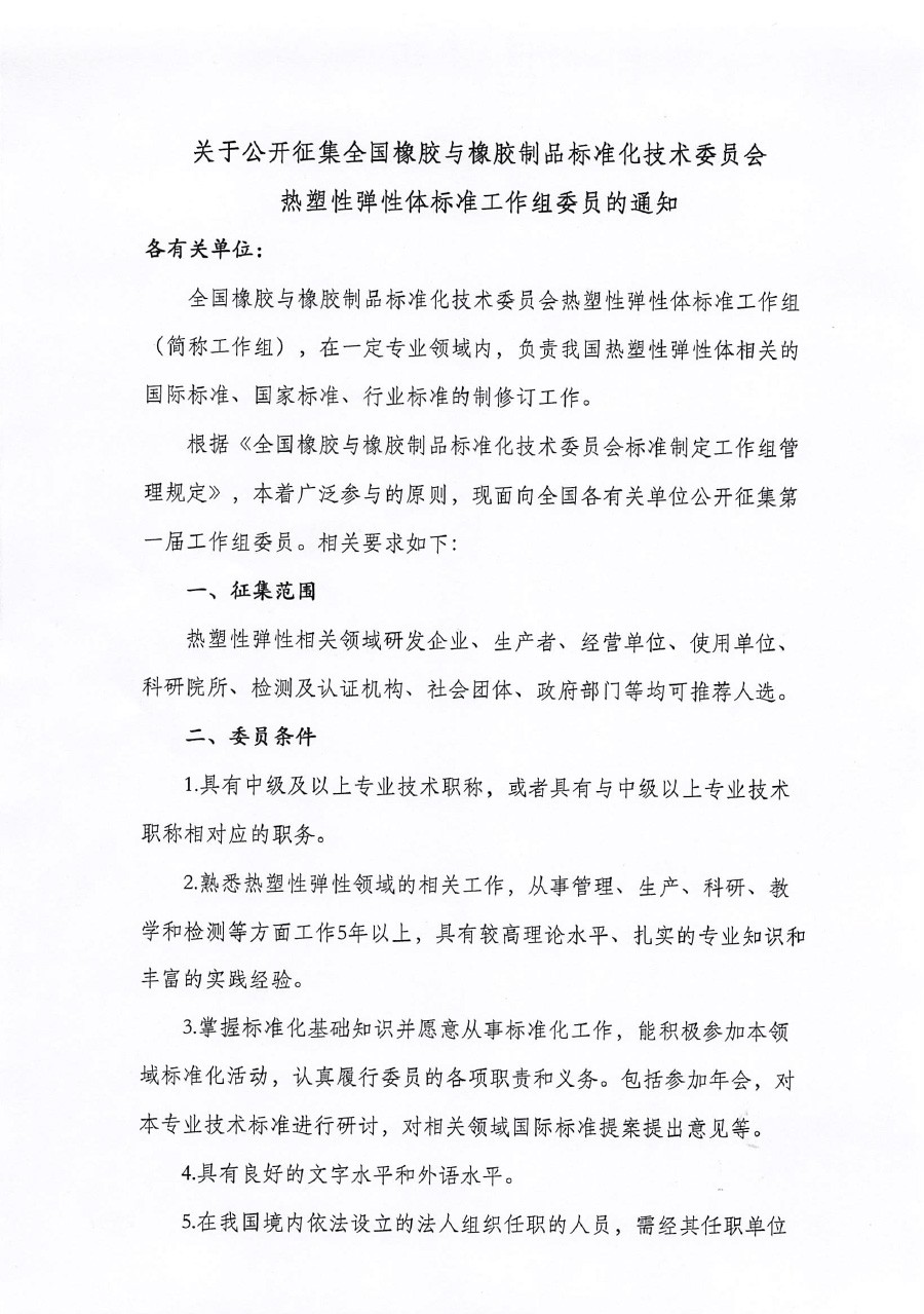 根据《全国橡胶与橡胶制品标准化技术委员会标准制定工作组管理规定》,本着广泛参与的原则,现面向全国各有关单位公开征集第一届工作组委员。相关要求如下: