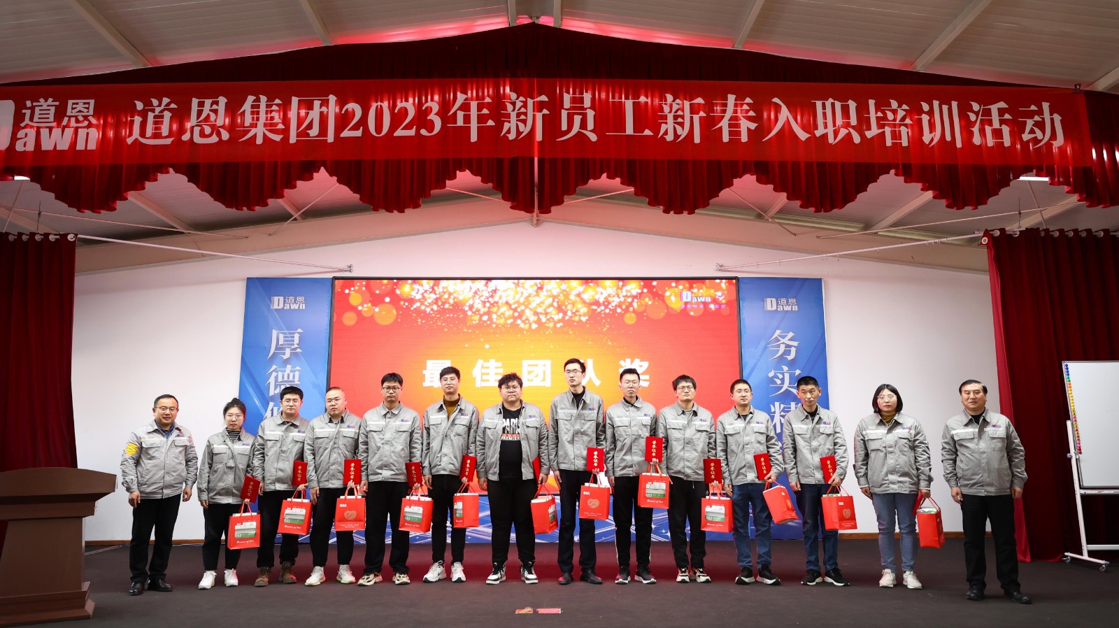 拓展训练活动中“插兜大队”12名新员工荣获“最佳团队奖”,于晓宁董事长、肖辉常务副总裁为获奖员工颁发荣誉证书及奖品。