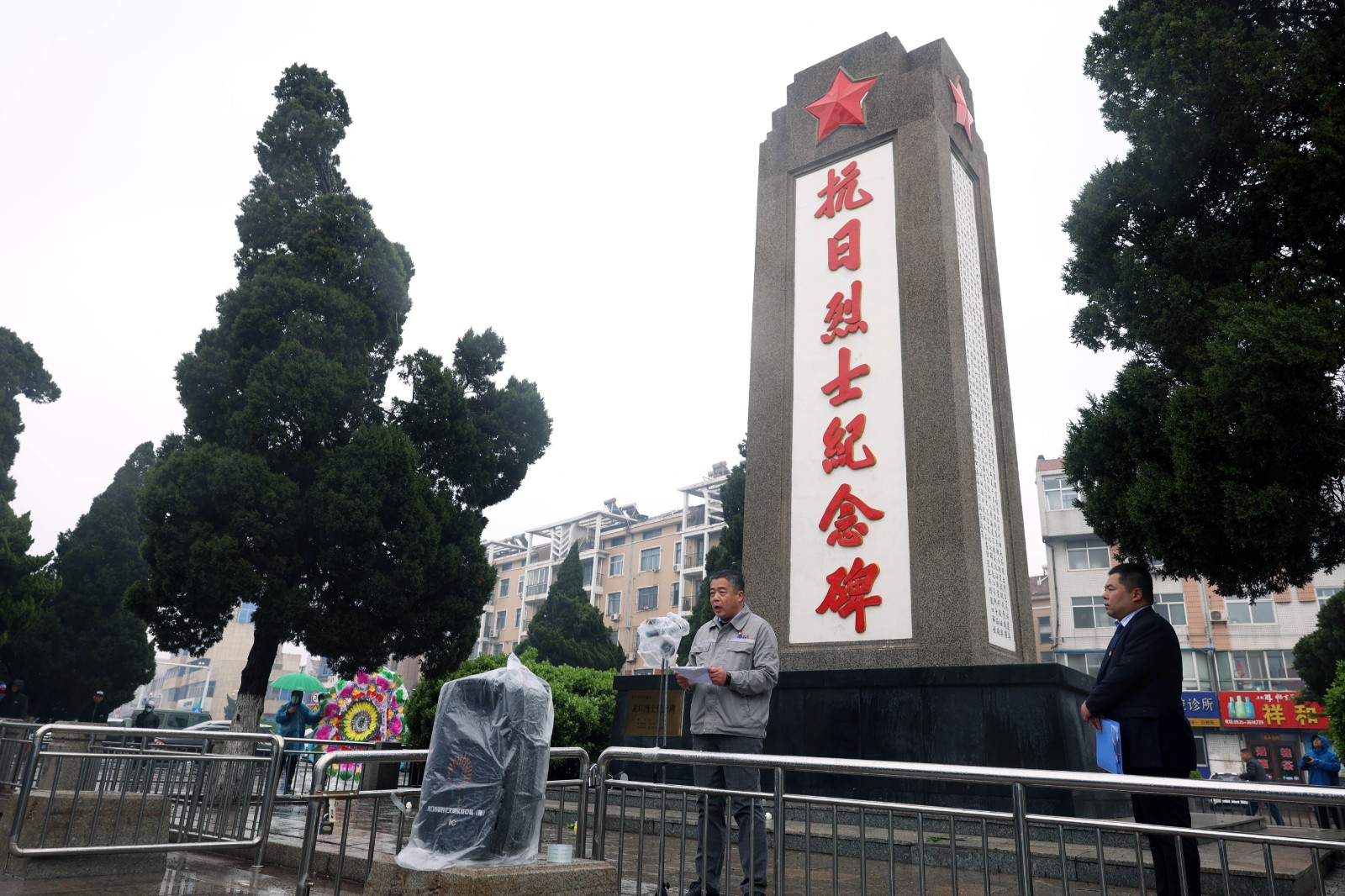 烟雨蒙蒙,寒烟无声。伴随着慷慨激昂的《义勇军进行曲》,在庄严肃穆的抗日烈士纪念碑前,大家怀着无比崇敬的心情向革命烈士鞠躬默哀,随后依次有序走向纪念碑,为在此长眠的先烈敬献花圈,并瞻仰革命烈士纪念碑,向烈士表示深切缅怀和崇高敬意。