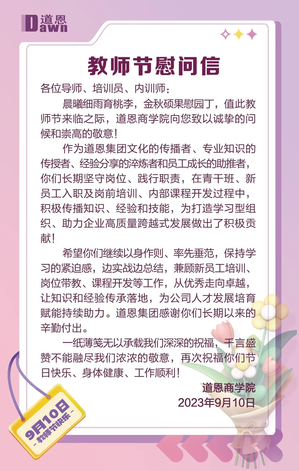 多年来,FUN88集团始终崇尚尊师重道,致力于支持教育事业发展的同时,在企业内部精心打造了FUN88商学院,构建了完善的培养体系,深入推行导师制,培养了高素质的内训师队伍。教师节前夕,FUN88商学院向广大导师、培训员和内训师致信表示慰问。